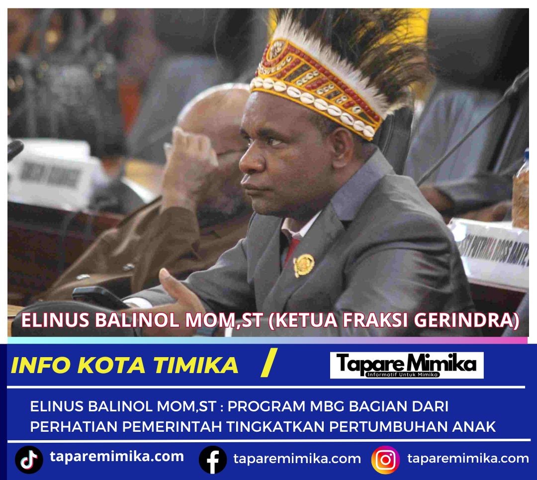 TIMIKA,(taparemimika.com) – Anggota Dewan Perwakilan Rakyat Kabupaten (DPRK) Mimika – Provinsi Papua Tengah dari Partai Gerakan Indonesia Raya (Gerindra), Elinus Balinol Mom, ST, menyebut program Makanan Bergizi Gratis (MBG) salah satu bentuk perhatian pemerintah dalam meningkatkan kualitas pertumbuhan anak anak.