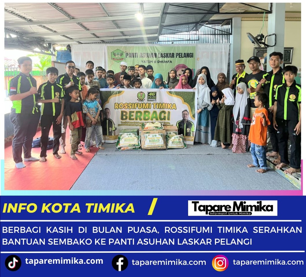 Penyerahan Bantuan Sembako dari ‘Rossifumi Timika’ kepada Pantia Asuhan Laskar Pelangi dilakukan pada Minggu (16/3/2025) sekitar Pukul 16.00 WIT, diserahkan langsung oleh Ketua Rossifumi Timika, Rahman didampingi Wakil Ketua Alvian, Bagian Humas Andi Liany serta anggota lainnya, Sony, Roky, Sandi dan Irfan.