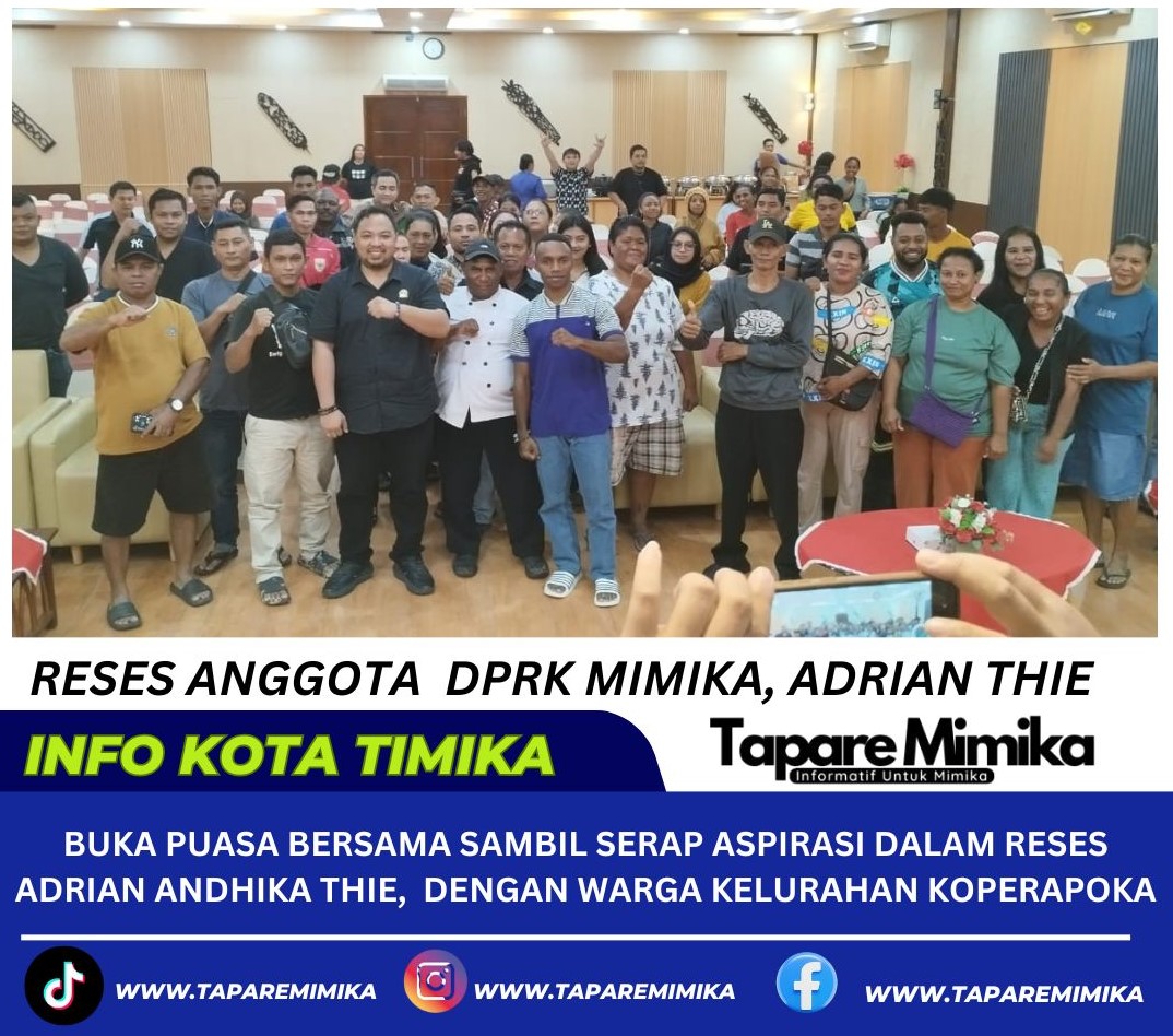 TIMIKA, (taparemimika.com) – Anggota Dewan Perwakilan Rakyat Kabupaten (DPRK) Mimika, dari Partai Demokrasi Indonesia Perjuangan (PDIP), Adrian Andhika Thie pada hari Kamis (20/3/2025) Sore menjelang petang, menggelar Buka Puasa Bersama (Bukber) sambil menyerap aspirasi dan usulan dari warga di Kelurahan Koperapoka Timika, Kabupaten Mimika, Provinsi Papua Tengah dalam kegiatan Reses Tahap Pertama tahun anggaran 2025.