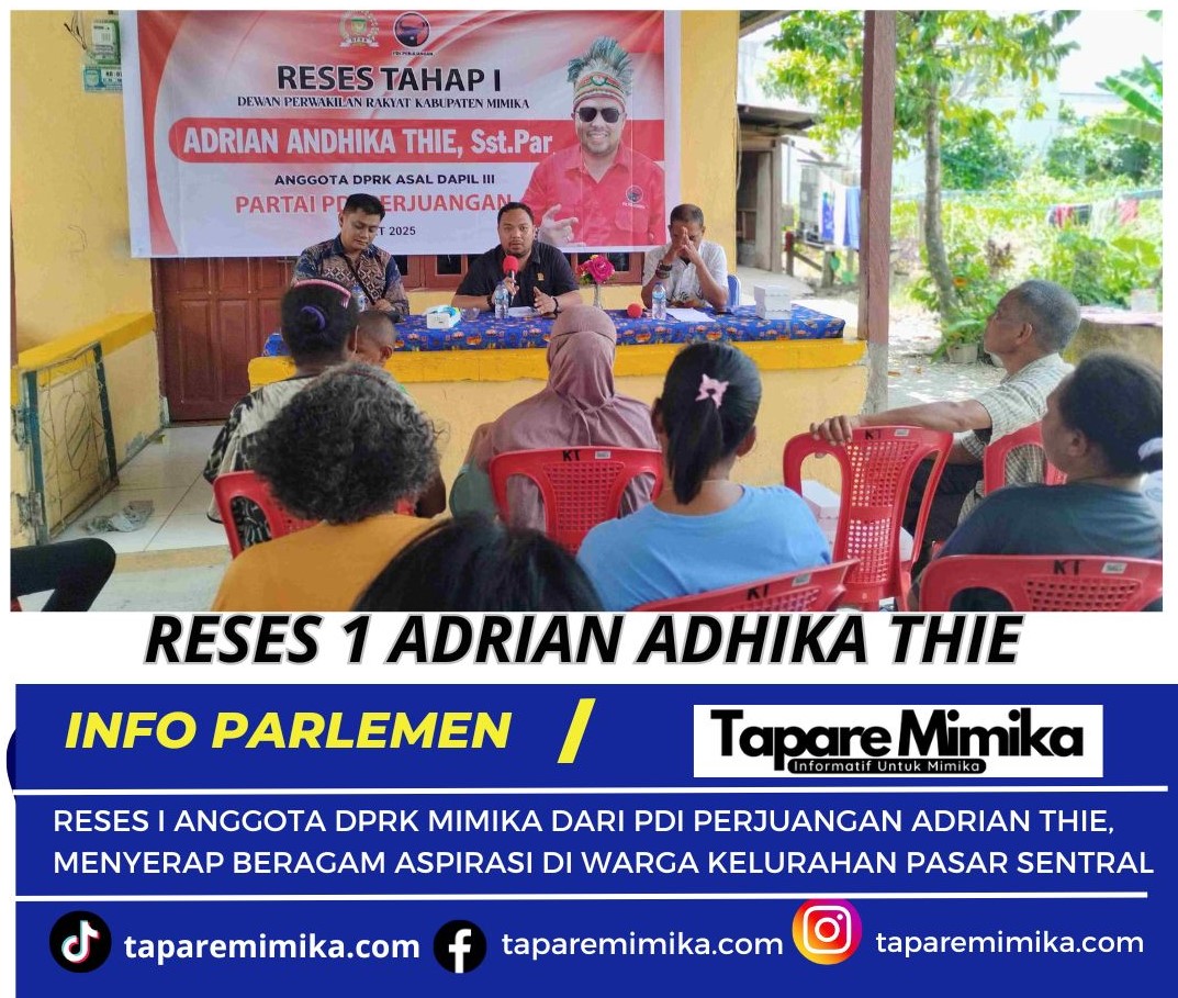 TIMIKA, (taparemimika.com) – Anggota Dewan Perwakilan Rakyat Kabupaten (DPRK) Mimika, Provinsi Papua Tengah dari Partai Demokrasi Indonesia Perjuangan (PDIP) daerah Pemilihan III, Adrian Andhika Thie,S.St,Par menggelar reses tahap pertama tahun 2025 dengan menyerap berbagai aspirasi dari warga di Kelurahan Pasar Sentral Timika, Distrik Mimika Baru, Kabupaten Mimika pada Kamis (20/3/2025).