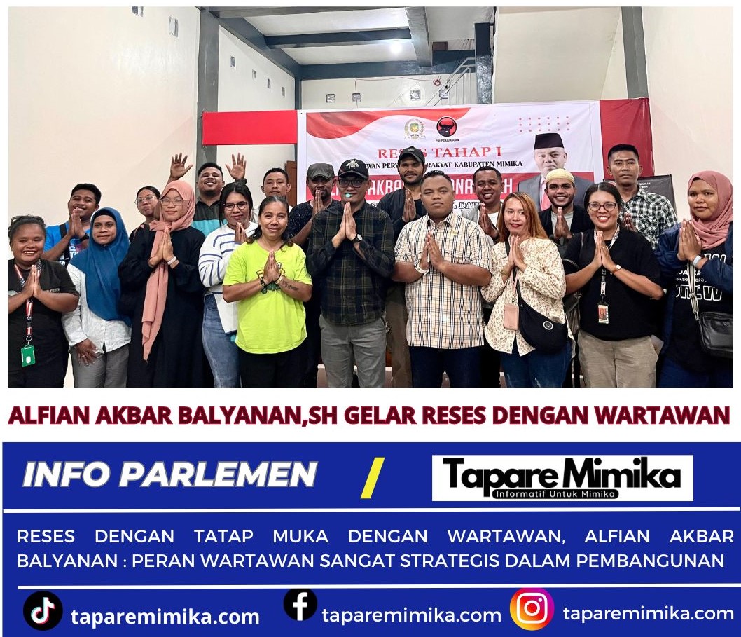 TIMIKA, (taparemimika.com) – Menggelar reses dengan insan pers (wartawan) anggota Dewan Perwakilan Rakyat Kabupaten (DPRK) Mimika – Papua Tengah, dari daerah pemilihan (Dapil) II, Partai Demokrasi Indonesia Perjuangan (PDIP), Alfian Akbar Balyanan, SH menegaskan bahwa peran wartawan sangat strategis dalam mengikuti perkembangan pembangunan Kabupaten Mimika.