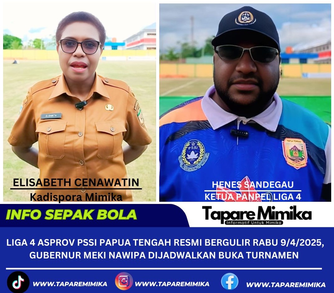 TIMIKA, (taparemimika.com) – Liga 4 Indonesia Regional Papua Tengah Tahun 2024-2025 yang digelar Asprov PSSI Papua Tengah akan resmi dibuka Rabu (9/4/2025) hari ini di Stadion Wania Imipi SP1, Distrik Wania, Kabupaten Mimika, Papua Tengah. Turnamen perdana ini rencananya akan dibuka langsung oleh Gubernur Papua Tengah, Meki Nawipa, dan dihadiri oleh 8 Kepala Daerah atau bupati se Papua Tengah.