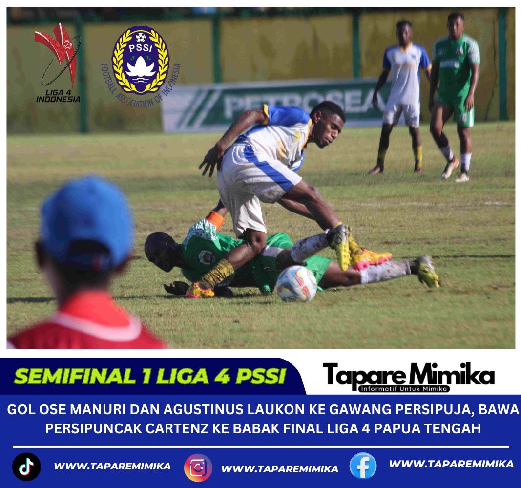 TIMIKA, (taparemimika.com) – Satu gol dari pemain Ose Mario Manuri (11) dan Agustinus Maickel J Laukon (17) yang mengalahkan kesebelasan Persipuja Puncak Jaya-2-1 mampu mengantarkan kesebelasan Persipuncak Puncak Cartenz lolos ke babak Final Kompetisi Sepakbola Liga 4 Regional PSSI Papua Tengah yang akan dilaksanakan pada Kamis (17/4/2025) besok.