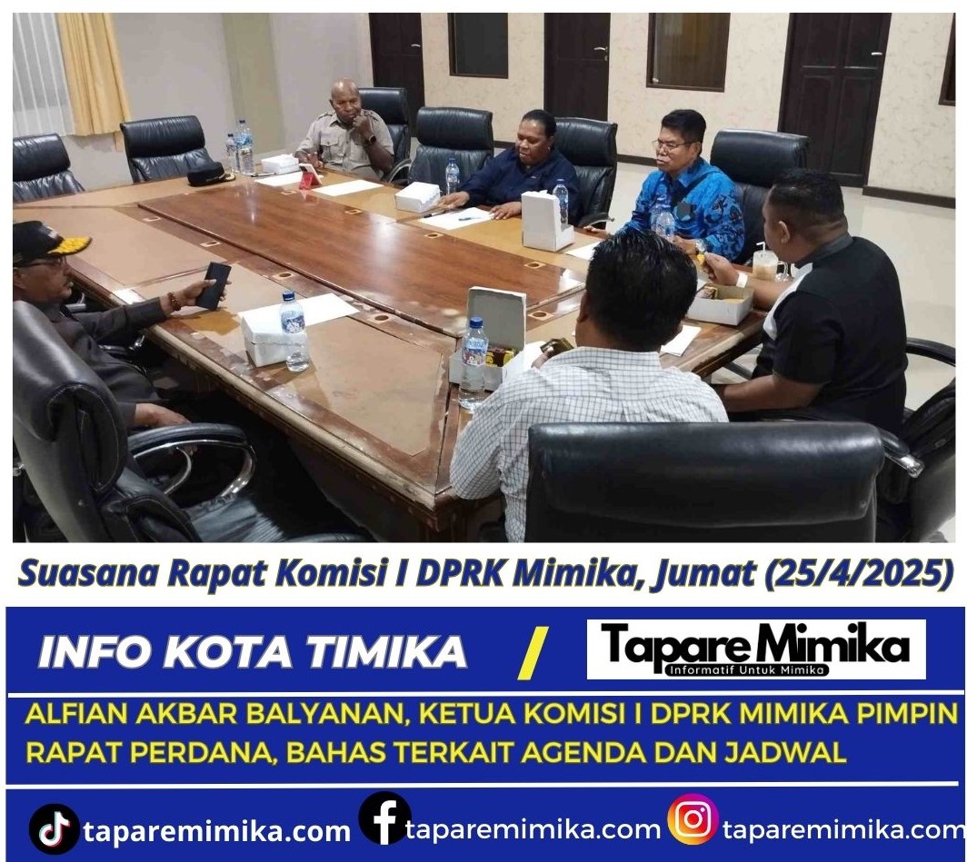 TIMIKA, (taparemimika.com) – Ketua Komisi I Dewan Perwakilan Rakyat Daerah (DPRK) Mimika, Provinsi Papua Tengah, Alfian Akbar Balyanan,SH pada Jumat (25/4/2025) siang memimpin rapat pertama Komisi I dengan agenda membahas jadwal dan agenda Komisi I yang membidangi Pemerintahan dan Hukum.