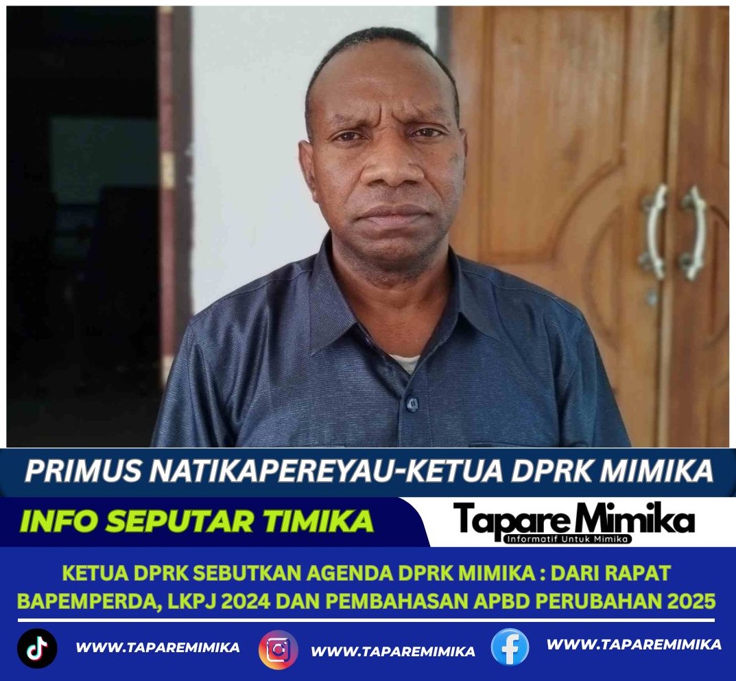 TIMIKA, (taparemimika.com) – Lembaga Dewan Perwakilan Rakyat Kabupaten (DPRK) Mimika dalam waktu dekat ini akan padat dengan sejumlah agenda, mulai dari pembahasan pengusualn Rancangan Peraturan Daerah (Ranperda) Inisiatif Dewan melalui Badan Pembentukan Peraturan Daerah (Bapemperda) DPRK Mimika, Paripurna Laporan Keterangan Pertanggungjawaban (LKPJ) Pemerintah Daerah tahun anggaran 2024 hingga pembahasan APBD Perubahan tahun anggaran 2025.