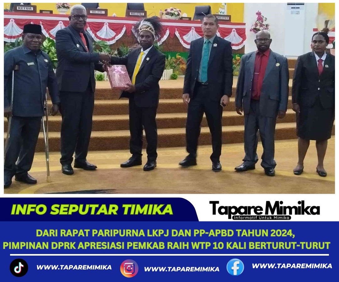 Ketua DPRK Mimika, Primus Natikapereyau dalam sambutannya mengapresiasi hasil dan capaian Pemerintah Daerah dengan mendapatkan Opini Wajar Tanpa Pengecualian (WTP) dalam hal pengelolaan keuangan daerah ditahun 2024 telah memenuhi standar akuntansi.