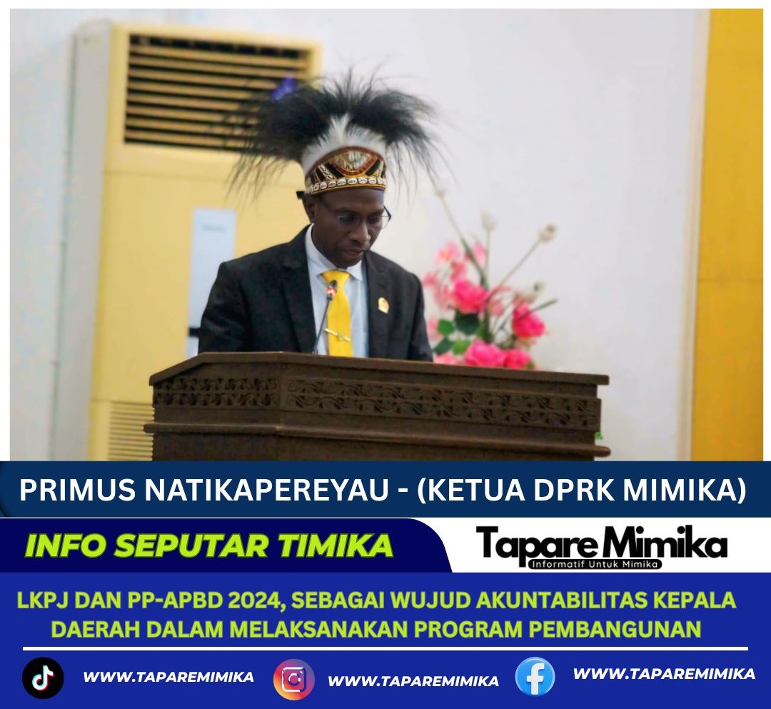 TIMIKA, (taparemimika.com) – Ketua Dewan Perwakilan Rakyat Kabupaten (DPRK) Mimika, Primus Natikapereyau menegaskan, bahwa penyampaian Laporan Pertanggungjawaban LKPJ Bupati Mimika dan Pertanggungjawaban Pelaksanaan Anggaran Pendapatan dan Belanja Kabupaten Mimika Tahun Anggaran 2024 kepada lembaga DPRK adalah merupakan amanah konstitusi dan undang-undang nomor 23 tahun 2014 tentang pemerintahan daerah, sebagai wujud akuntabilitas kepala daerah dalam melaksanakan program dan kegiatan pembangunan sepanjang tahun 2024 dan pencapaian sasaran pembangunan dan kinerja pelaksanaan program kegiatan menjadi hal yang harus dipertanggungjawabkan sebagai informasi terhadap pelaksanaan pembangunan jangka menengah.