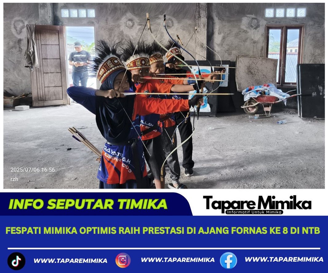 TIMIKA, (taparemimika.com) – Kontingen Tim Federasi Seni Panahan Tradisional Indonesia (FESPATI) Kabupaten Mimika optimis mengukir prestasi pada ajang ajang Festival Olahraga Rekreasi Nasional (FORNAS) ke-8 yang akan digelar sejak 26 Juli hingga 1 Agustus 2025 mendatang di Mandalika, Provinsi Nusa Tenggara Barat (NTB).