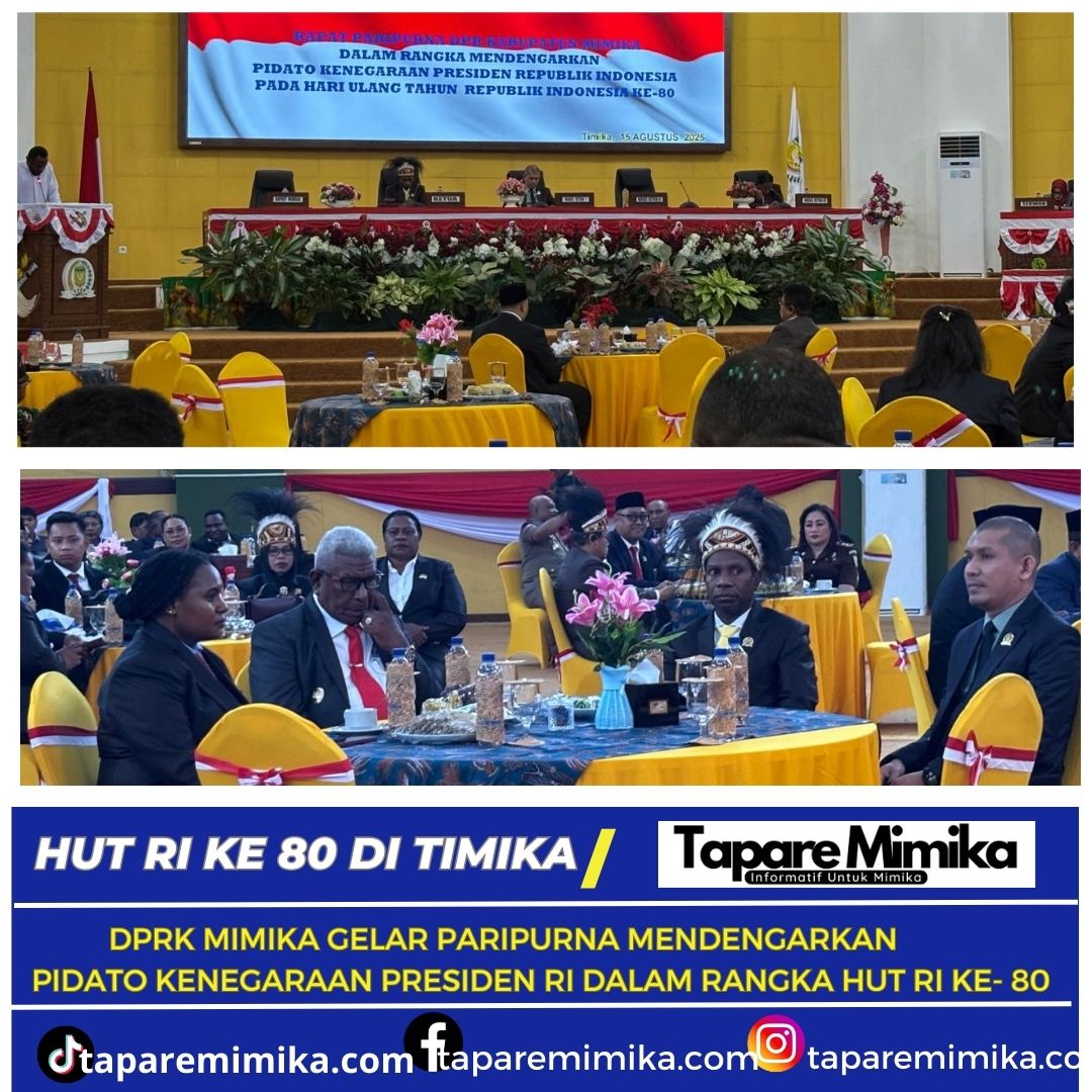 Rapat Paripurna yang digelar di Gedung Paripurna Kantor DPRK Mimika, dengan agenda mendengarkan Pidatio Kenegaraan Presiden Republik Indonesia (RI) dalam rangka Hari Ulang Tahun (HUT) Kemerdekaan Negara Republik (RI) yang ke- 80  tahun berlangsung di ruang rapat paripurna DPRK  Mimika – Papua Tengah, Jalan Cendrawasih SP 2, Timika – Mimika – Papua Tengah, Jumat (15/8/2025).