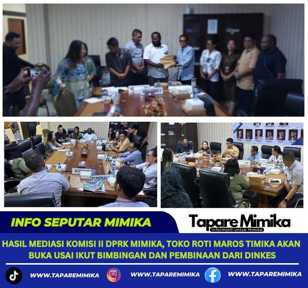 Kesepakatan ini terungkap dari hasil pertemuan yang dimediasi oleh Komisi II DPRK Mimika, dengan Pemilik Usaha Roti Maros, Dinas Kesehatan, Dinas Perindustrian dan Perdagangan Kabupaten Mimika yang berlangsung di ruang Rapat Komisi II DPRK Mimika, Pada Jumat (3/10/2025) pagi tadi.