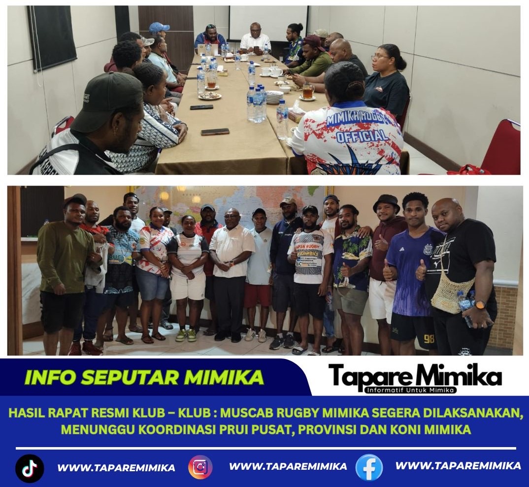TIMIKA, (taparemimika.com) – Berdasarkan hasil rapat resmi dari Klub-klub yang bernaung di Pengurus Union Rugby Indonesia (PRUI) kabupaten Mimika yang digelar pada Kamis (2/10/2025) malam di Salah Satu Hotel di Jalan Cendrawasih Timika, Kabupaten Mimika, menetapkan untuk segera secepatnya melakukan Musyawarah Cabang (Muscab) PRUI Mimika untuk memilih kepengurusan Periode 2025-2029.