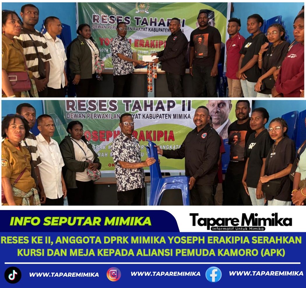 TIMIKA, (taparemimika.com) – Pada kegiatan Reses Ke II tahun 2025 Anggota Dewan Perwakilan Rakyat Daerah (DPRK) Mimika, Provinsi Papua Tengah dari Jalur Pengangkatan, Yoseph Erakipia menyerahkan bantuan berupa dana untuk kebutuhan operasional, kursi dan meja untuk operasional Sekretariatan, serta Bahan Makanan (BAMA) di Sekretariat Aliansi Pemuda Kamoro (APK) Kabupaten Mimika, pada Senin (6/10/2025).