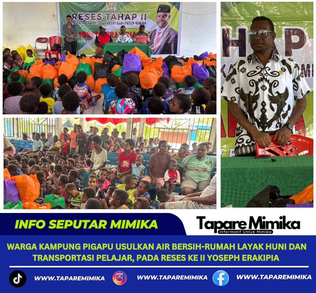 Dalam kegiatan reses ke II anggota DPRK Mimika, Yoseph Erakipia yang digelar di Kampung Pigapu,Distrik Iwaka, Kabupaten Mimika pada Selasa (7/10/2025) siang, beberapa usulan penting disampaikan warga salah satunya terkait kebutuhan air bersih.