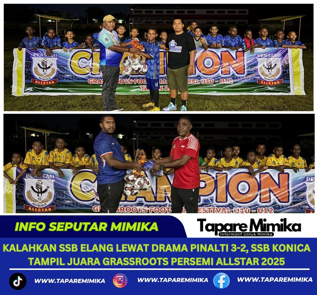 TIMIKA,(taparemimika.com) – Kalahkan SSB Elang melalui drama adu pinalti dengan skor 3-2, SSB Konica akhirnya tampil sebagai juara pertama Grassroots Festival Football Persemi Allstar U10-U12 yang berlangsung di Stadion Wania Imipi SP 1, Timika kabupaten Mimika Papua Tengah. Minggu (12/10/2025).