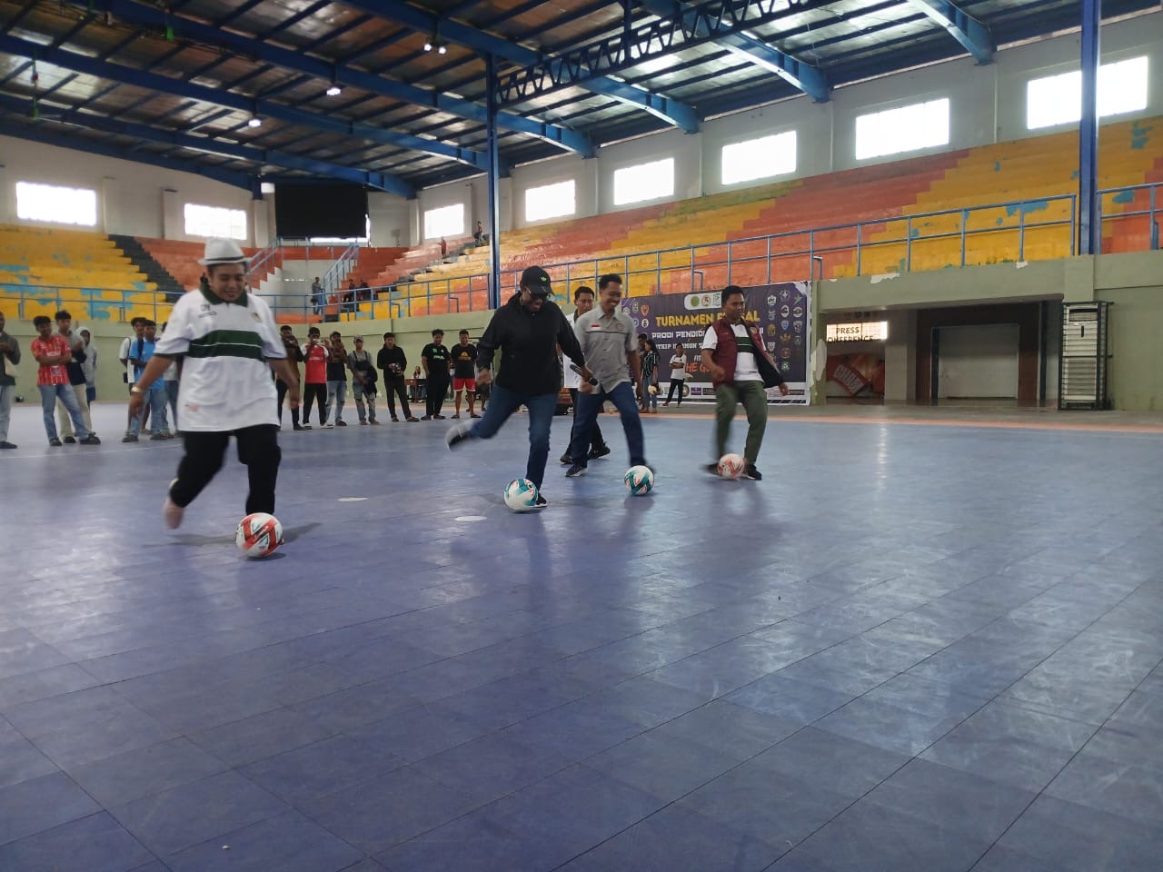 Ketua STKIP Herman Timika, Densemina Y Wabdarom,M,Pd, turut hadir Kepala Dinas Pariwisata Kebudayaan Pemuda dan Olahraga Kabupaten Mimika, Elisabeth Cenawatin, Saat melakukan tendangan perdana sekaligus pembukaan Open Turnamen Futsal Prodi Penjas STKIP Hermon Timika Cup 2 tahun 2025 yang berlangsung di GOR Futsal SP 5 Timika, Minggu (19/10/2025)/Foto : Wahyudin Yuyunk