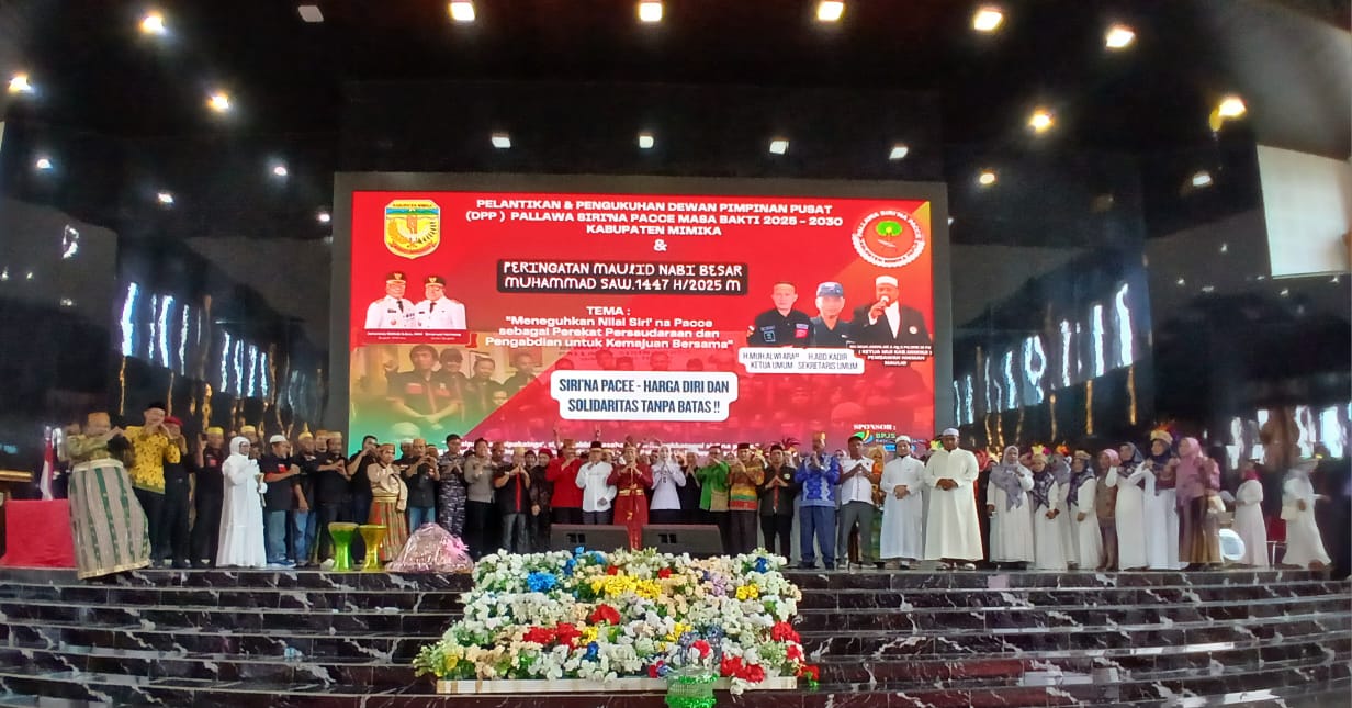 TIMIKA, (taparemimika.com) – Dewan Pmpinan Pengurus Pusat (DPP) Pallawa Siri’Na Pacce kabupaten Mimika provinsi Papua Tengah menyelenggrakan acara pelantikan dan pengukuhan di rangkaikan peringatan Maulid Nabi Besar Muhammad (SAW) 1447 Hijriah 2025M. Acara tersebut berlangsung di gedung Serbaguna Eme Neme Yaware Jalan Budi Utomo Timika.