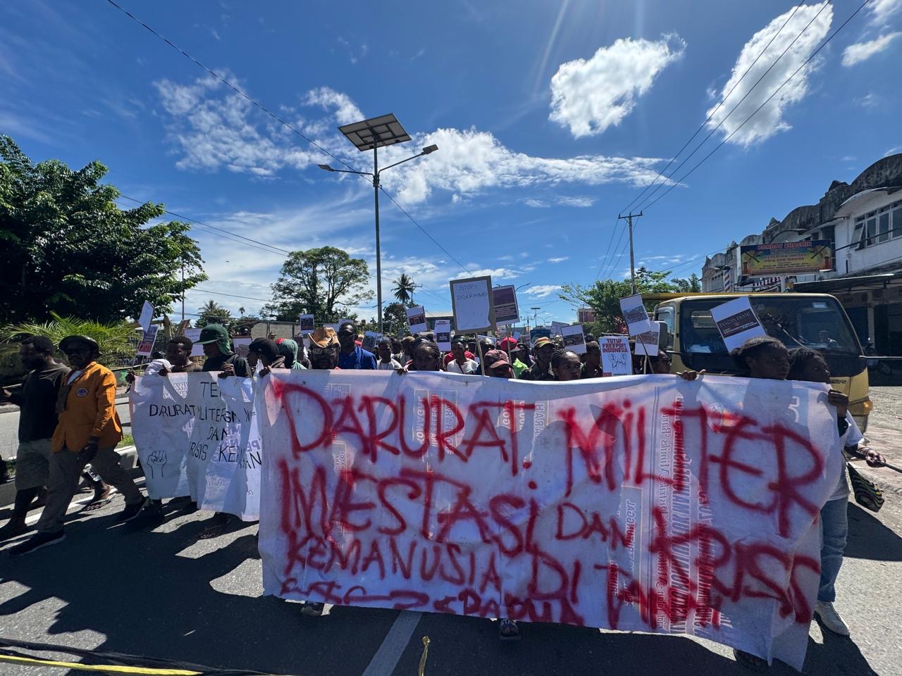 Sejumlah spanduk yang dibawa, FIM-WP-KPK diantaranya bertuliskan ‘ hentikan militerisasi di atas Papua’, ‘tolak Proyek Strategis Nasional (PSN) di Merauke yang menimbulkan ekosida dan genosida yang terstruktur’, ‘tolak eksploitasi blok wabu di Intan Jaya, Migas di Agimuga I dan II, dan seluruh investasi di atas tanah Papua’.