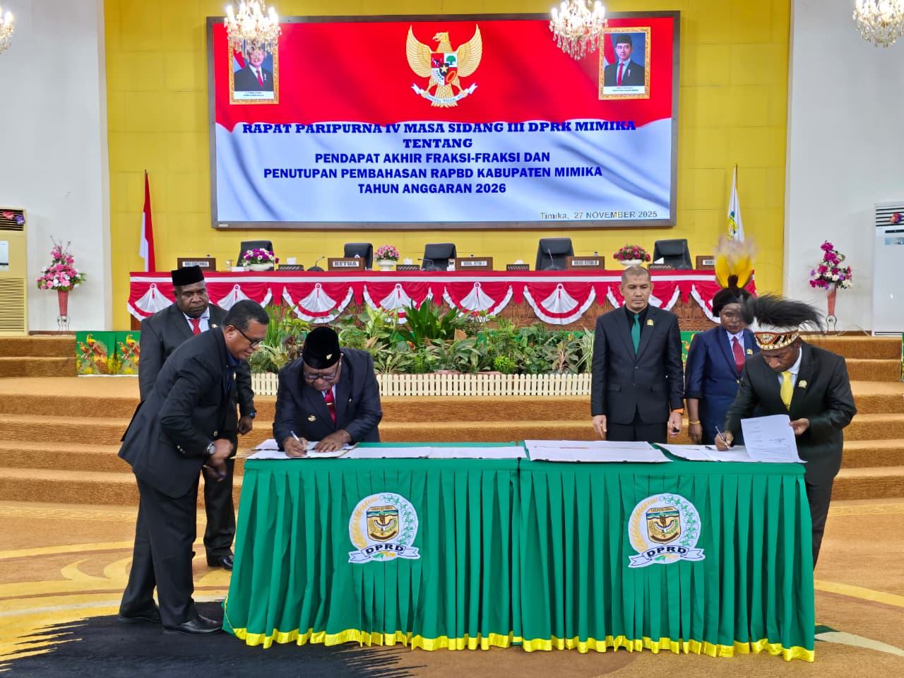 Dalam pelaksanaan pembangunan pada tahun 2026 kami berkomitmen bahwa DPRK menjadi mitra yang sejajar dan konstruktif dalam mengawal pembangunan dan penyelenggaraan pemerintahan.” Dengan ditandatangani persetujuan bersama tentang RAPBD tahun anggaran 2026 sebesar Rp 5.644.590.782.243,00 selanjutnya akan disampaikan ke Provinsi Papua Tengah untuk dievaluasi dan ditetapkan sebagai APBD tahun anggaran 2026, semua proses tahapan penyusunan APBD tahun anggaran 2026 dapat diselesaikan tepat waktu sehingga pelaksanaan semua program kegiatan dapat di mulai bulan januari tahun 2026.