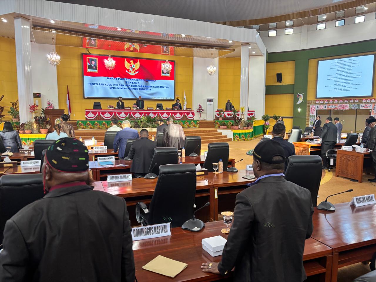 TIMIKA, (taparemimika.com) – Dewan Perwakilan Rakyat Kabupaten Mimika pada Kamis (27/11/2025) menggelar Rapat Paripurna Penetapan Kode Etik Berada Badan Kehormatan (BK) yang berlangsung di Ruang Sidang Paripurna di kantor DPRK Mimika di Jalan Cendrawasih SP 2, Timika kabupaten Mimika Papua Tengah.