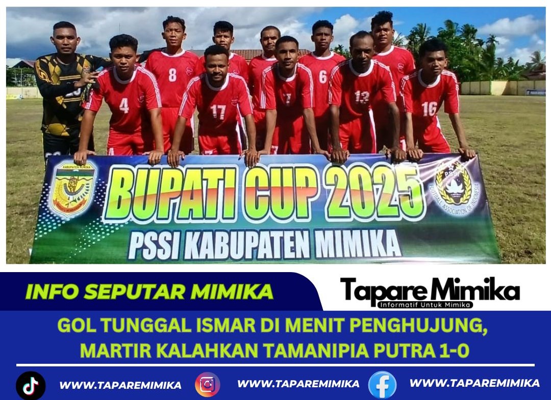 TIMIKA, (taparemimika.com) – Gol tunggal di penghujung babak Kedua oleh pemain Ismar (10) tepatnya di menit ke 65 babak kedua, mampu menghantarkan kesebelasan Martir memetik poin tiga dengan mengalahkan Kesebelasan Tamanipia Putra dengan skor 1-0 dilaga babak penyisihan Pool C Turnamen Sepakhbola Piala Bupati Mimika U-22 Tahun 2025 yang berlangsung di Stadion Wania Imipi, Kelurahan Kamoro Jaya Timika, Kabupaten Mimika Papua Tengah, Senin (1/12/2025).