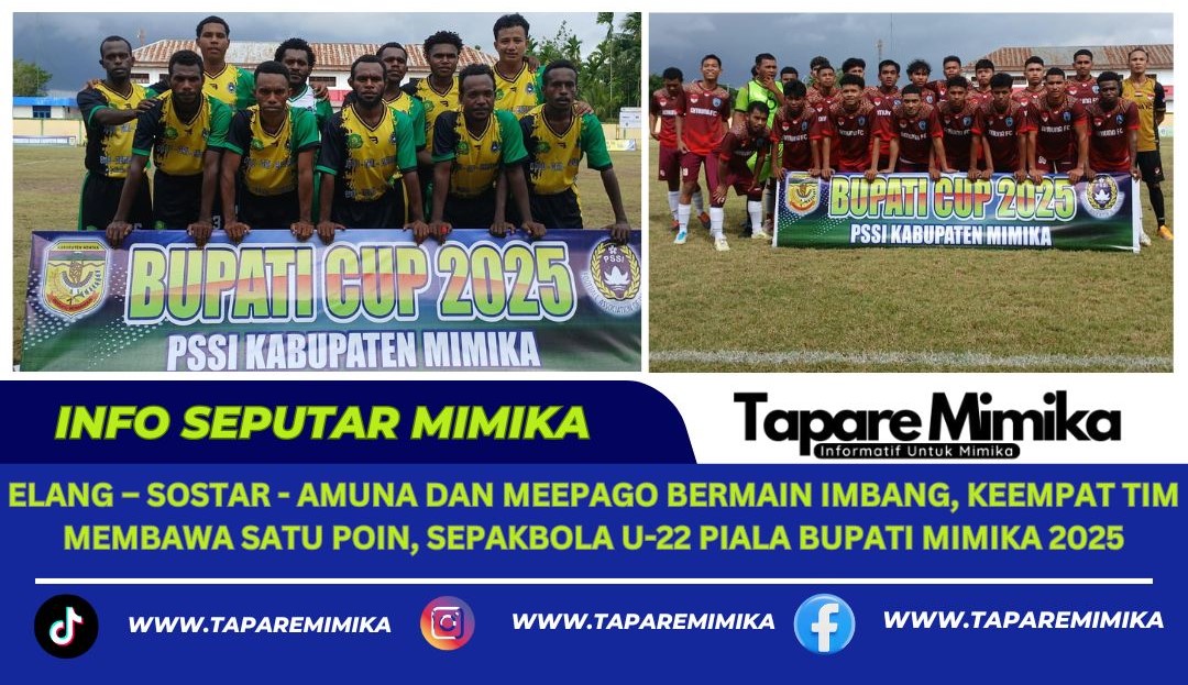 TIMIKA, (taparemimika.com) – Pertandingan Sepakbola Piala Bupati Mimika U-22 Tahun 2025 Asosiasi PSSI Kabupaten Mimika babak penyisihan Pool E yang berlangsung di Stadion Wania Imipi SP 1, Kelurahan Kamoro Jaya Distrik Wania Kabupaten Mimika pada Selasa (2/12/2025), keempat tim Elang, Sostar, Meepago, dan Amuna harus puas membawa pulang masing-masing satu poin, setelah bermain imbang.