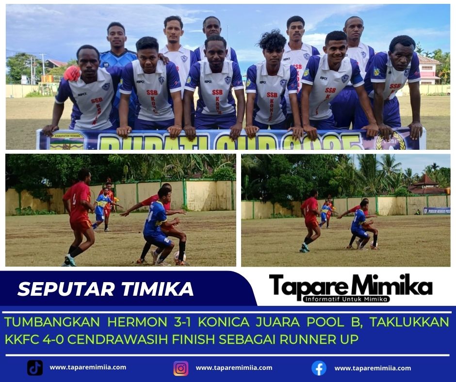 TIMIKA, (taparemimika.com) – Tumbangkan kesebelasan Hermon dengan skor 3-1, kesebelasan Konica meraih poin sempurna sembilan dari tiga kali kemenangan dansekaligus kokoh sebagai pemimpin klasemen Pool B Turnamen Sepakbola U-22 Piala Bupati Mimika Askab PSSI Mimika U-22 Tahun 2025. Sementara Cendrawasih menadmpingi Konica lolos ke babak 16 besar setelah berhasil menang mudah atas Kuala Kencana Footbal Club (KKFC) dengan skor 4-0.