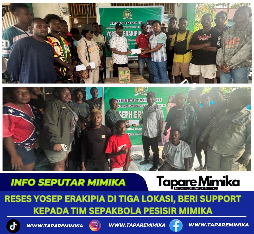 Tiga Lokasi yang dikunjungi Yosep Erakipia dalam reses tahap III tahun 2025, yaitu di Distrik Iwaka, Tim Sepakbola Aruka di Jalan Pattimura Ujung dan Tim Sepakbola Putra Tamanipia di Jalan Busiri Ujung Timika.