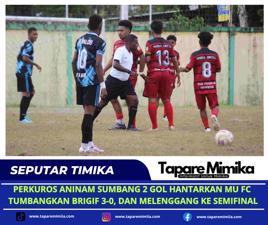 TIMIKA, (taparemimika.com) – Berkat dua gol dari pemain Perkuros Aninam (19) dan satu gol dari Maxy J Erar (7) mampu menghantarkkan kesebelasan Mimika United (MU) tumbangkan kesebelasan Brigif 20 IJK dengan skor 3-0, babak perempat final Turnamen Sepakbola Piala Bupati Mimika U-22 Askab PSSI Mimika Tahun 2025, yang berlangsung di Stadion Wania Imipi Sp 1, Kelurahan Kamoro Jaya Sp 1, Timika, Kabupaten Mimika Minggu (14/12/2025).