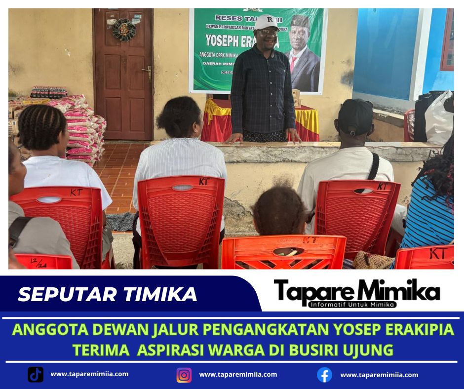 TIMIKA, (taparemimika.com) – Anggota Dewan Perwakilan Rakyat Kabupaten (DPRK) Mimika dari Jalur Pengangkatan , Yoseph Erakipia menerima sejumlah aspirasi dan usulan dari warga yang bermukim di Jalan Busiri Ujung, Kelurahan Pasar Sentral, Distrik Mimika Baru Kabupaten Mimika, Provinsi Papua Tengah, pada Selasa (16/12/2025).