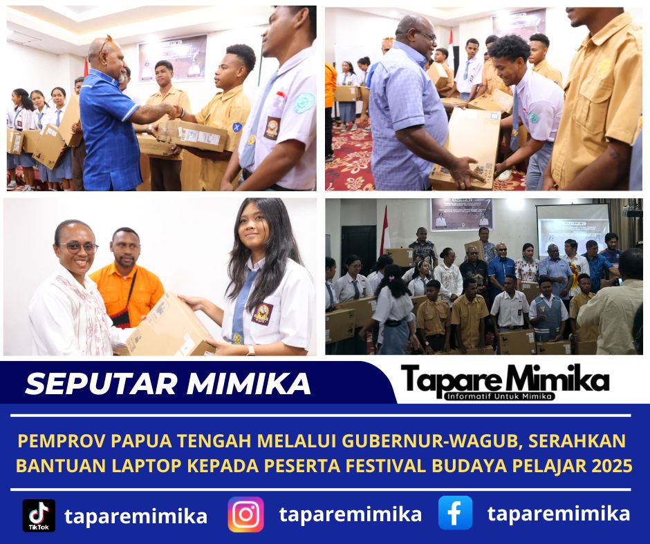 Penyerahan bantuan leptop bagi pelajar merupakan program pemerintah provinsi Papua Tengah melalui Dinas Pendidikan dan Kebudayaan melaksanakan kegiatan Penyerahan Bantuan Laptop kepada Peserta Festival Budaya Pelajar Tahun 2025.