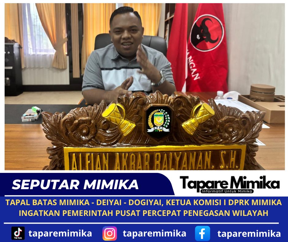 TIMIKA, (taparemimika.com) — Ketidak jelasan tapal batas antara Kabupaten Mimika dengan Kabupaten Deiyai dan Kabupaten Dogiyai kembali menjadi perhatian publik di Papua Tengah. Karena itu, Komisi I DPRK Mimika mengingatkan dan menegaskan kembali kepada Pemerintah Pusat (Pempus) agar persoalan tersebut bisa segera selesaikan.