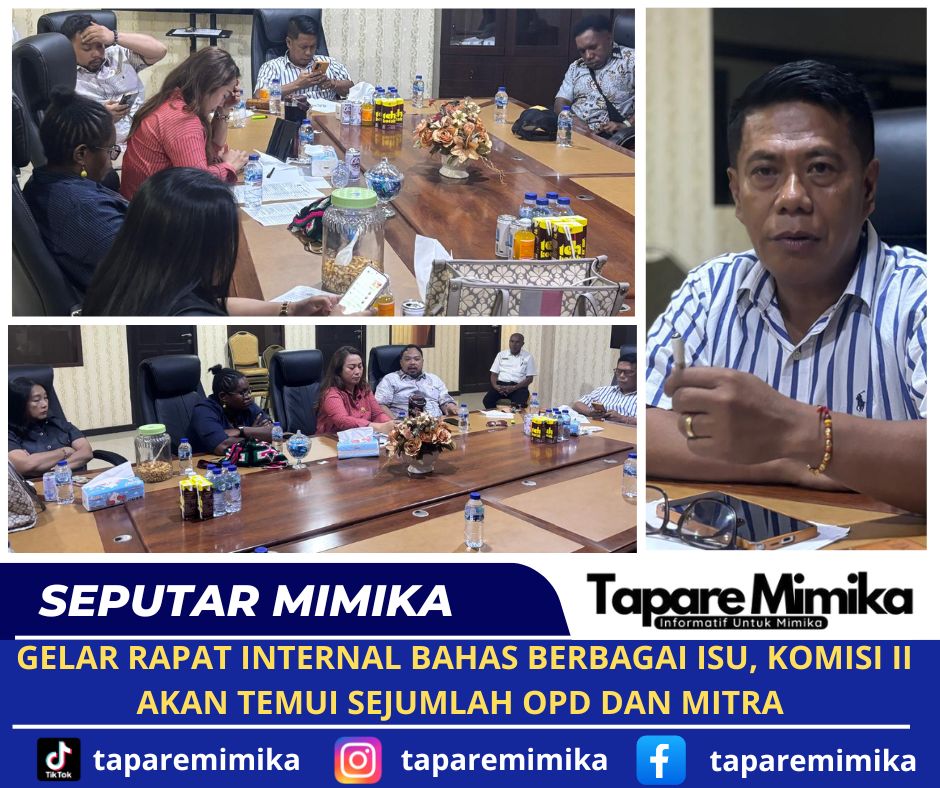TIMIKA, (taparemimika.com) – Membahas Rapat Internal terkait agenda kerja dengan menyesuaikan jadwal Badan Musyawarah (Bamus) Dewan Perwakilan Rakyat Kabupaten (DPRK) Mimika, Komisi II DPRK Mimika memutuskan untuk menemui dan berkunjung ke sejumlah Organisasi Perangkat Daerah (OPD) dan sejumlah mitra guna mencari Solusi terkait beberapa isu permasalahan yang ada di kalangan Masyarakat.