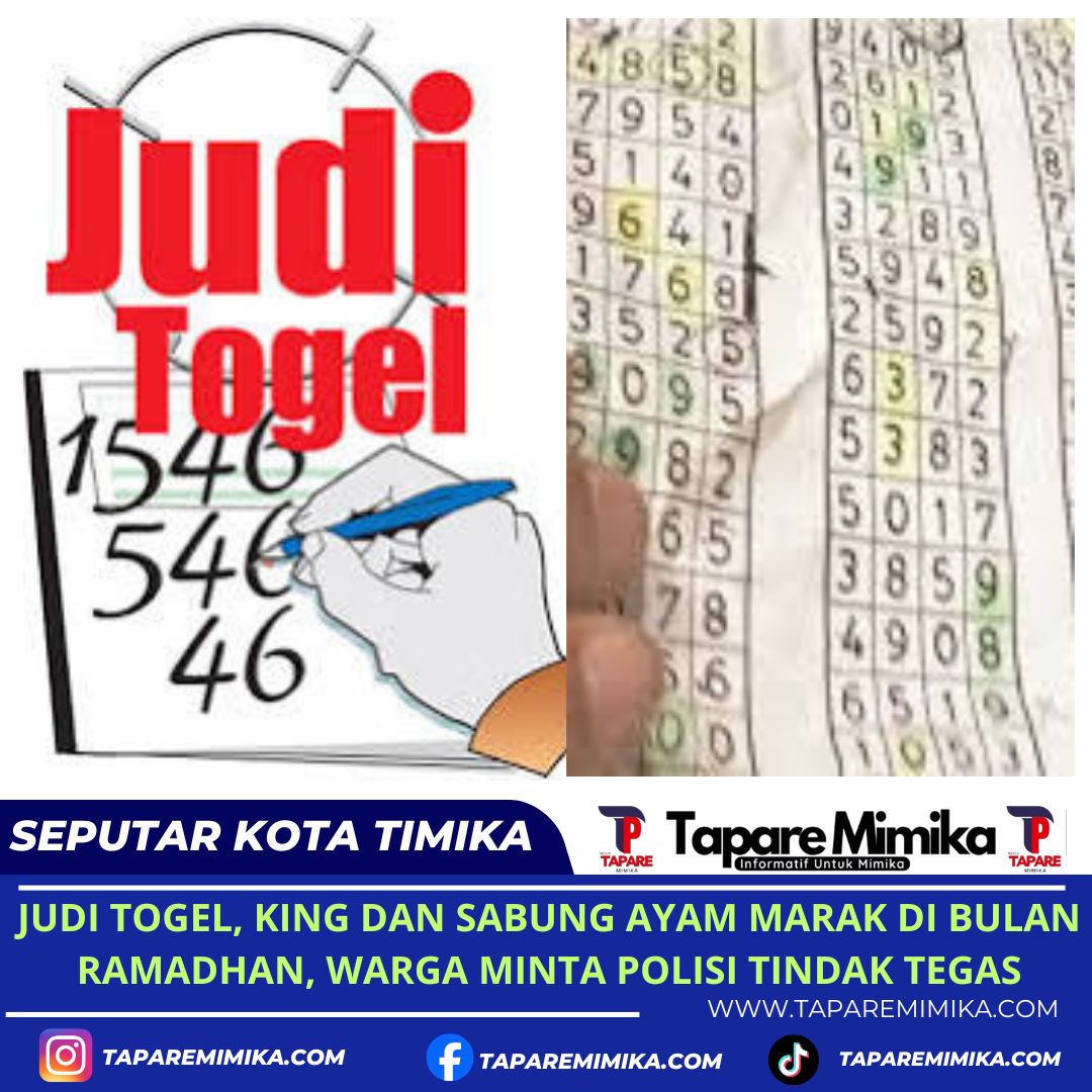 TIMIKA, (taparemimika.com) – Maraknya permainan judi, seperti King, Togel dan Sabung Ayam di kota Timika semakin menjadi-jadi, terlebih selama bulan suci ramadan hampir disemua sudut kota Timika dipenuhi dengan judi. Sejumlah warga mendesak aparat Kepolisian dapat menindak tegas tiga jenis judi yang terkesan dibiarkan.