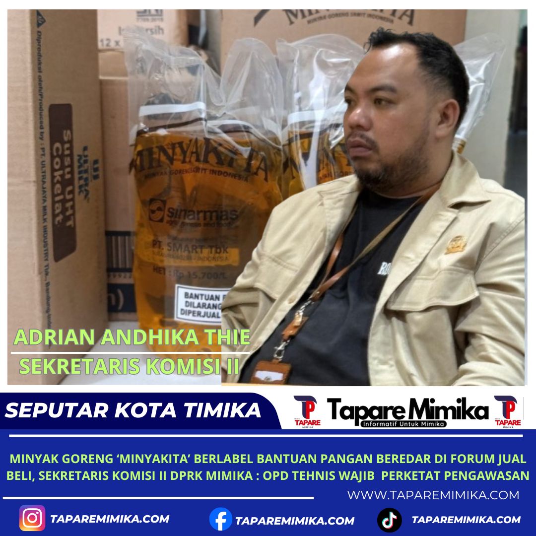 TIMIKA,(taparemimika.com) – Peredaran minyak goreng merek ‘Minyakita’ berlabel Bantuan Pangan Dilarang untuk diperjualbelikan diduga dijual bebas di pasaran Kota Timika, Kabupaten Mimika, mendapat tanggapan keras dari Sekretaris Komisi II DPRK Mimika, Adrian Andhika Thie.