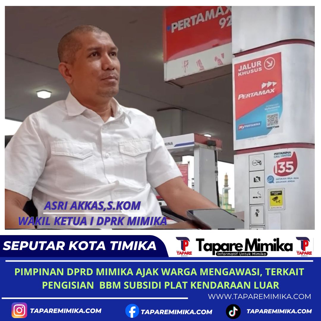 TIMIKA,(taparemimika.com) – Pimpinan Dewan Perwakilan (DPRK) Mimika melalui Wakil Ketua I, Asri Akkas,S.Kom, mengajak masyarakat untuk aktif mengawasi penyaluran bahan bakar minyak (BBM) bersubsidi di Stasiun Pengisian Bahan Bakar Umum (SPBU), menyusul pembatasan pengisian bagi kendaraan plat luar Timika yang telah diberlakukan sejak 15 Februari 2026.