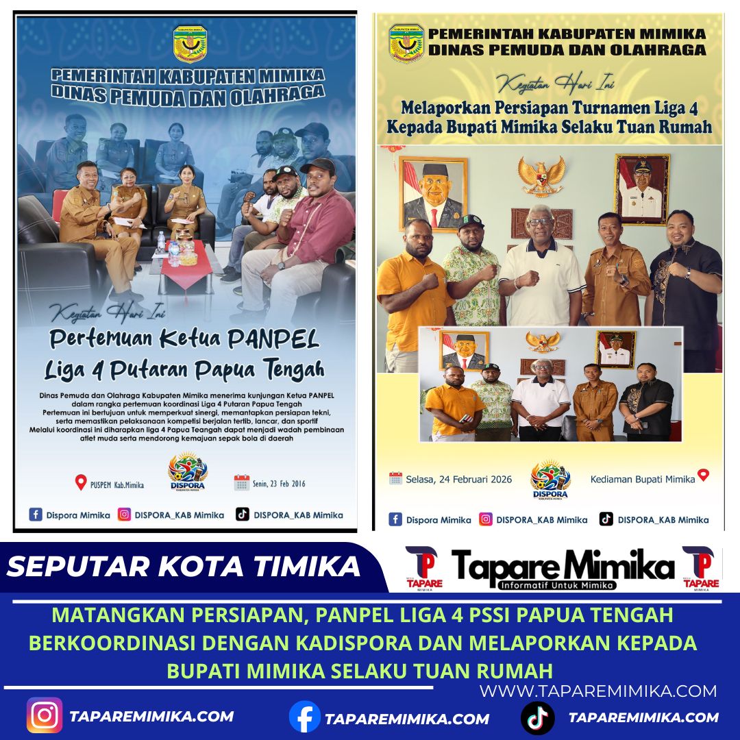 “Panpel Liga 4 PSSI Papua Tengah datang berkoordinasi dengan pemerintah Daerah sebagai tuan rumah dan punya aset Stadion Wania Imipi SP 1 sebagai tempat yang akan digunakan untuk kompetisi liga 4. Bersifat koordinasi dan bersinergi demi memantapkan menuju kesiapan kompetisi Liga 4 PSSI Papua Tengah yang akan dimulai 9 Maret 2026 mendatang di Timika,”tegas Mickael Yanwarin saat diitemui di Kantor Dispora Mimika di Kantor Pusat Pemerintahan SP 3, imika, Selasa (24/2/2026).