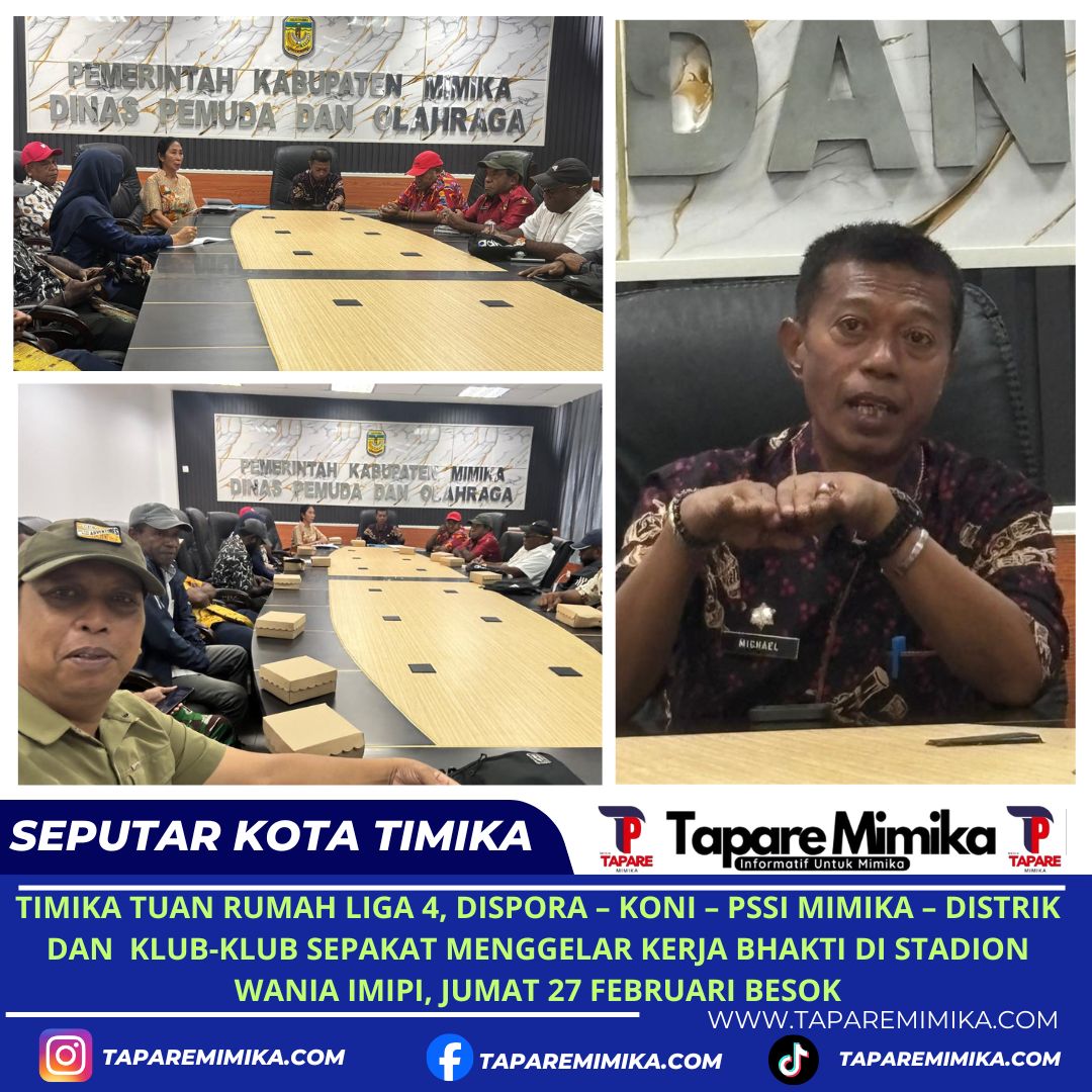 “Terkait hajatan liga 4 PSSI Papua Tengah yang digelar di Timika, sehingga selakau Dinas Pemuda dan Olahraga mengundang seluruh organisasi dan lembaga serta klub sepakbola untuk melakukan kerja bahkti massal di lokasi pelaksanaan Liga 4 Stadion Wania Imipi SP 1, kita sepakat kerja bhakti akan dilaksanakan pada Jumat (27/2/) besok. Jadi klub dan organsiasi bisa mengutus perwakilannya untuk terlibat,”ungkap Yohanis Michael Yanwarin.