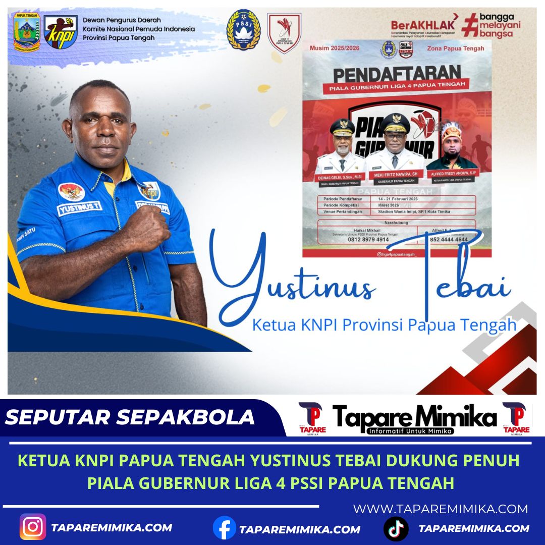 TIMIKA, (taparemimika.com) – Ketua Komite Nasional Pemuda Indonesia (KNPI) Provinsi Papua Tengah, Yustinus Tebai, menyatakan dukungan penuh terhadap penyelenggaraan Piala Gubernur Liga 4 Provinsi Papua Tengah sebagai momentum penting dalam pengembangan sepak bola serta pelatihan generasi muda di daerah.