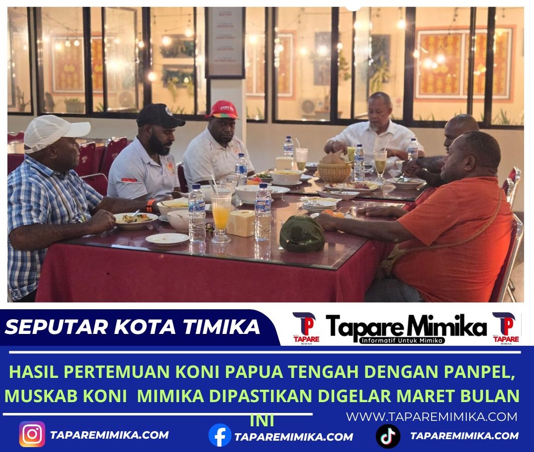 Hal tersebut terungkap dalam pertemuan antara Ketua KONI Papua Tengah Yosua Tipagau didampingi Sekretaris Umum Yeki Tobay, sementara dari Panpel Muskab KONI Mimika dihadiri oleh Ketua Panpel, Antonius Kemong, George deda Sekretaris Panpel dan Agus Roya sebagai panitia, yang digelar di Resto Cendrawasih Jalan Cendrawasih Sp 2 Timika, Senin (9/3/2026) malam tadi.