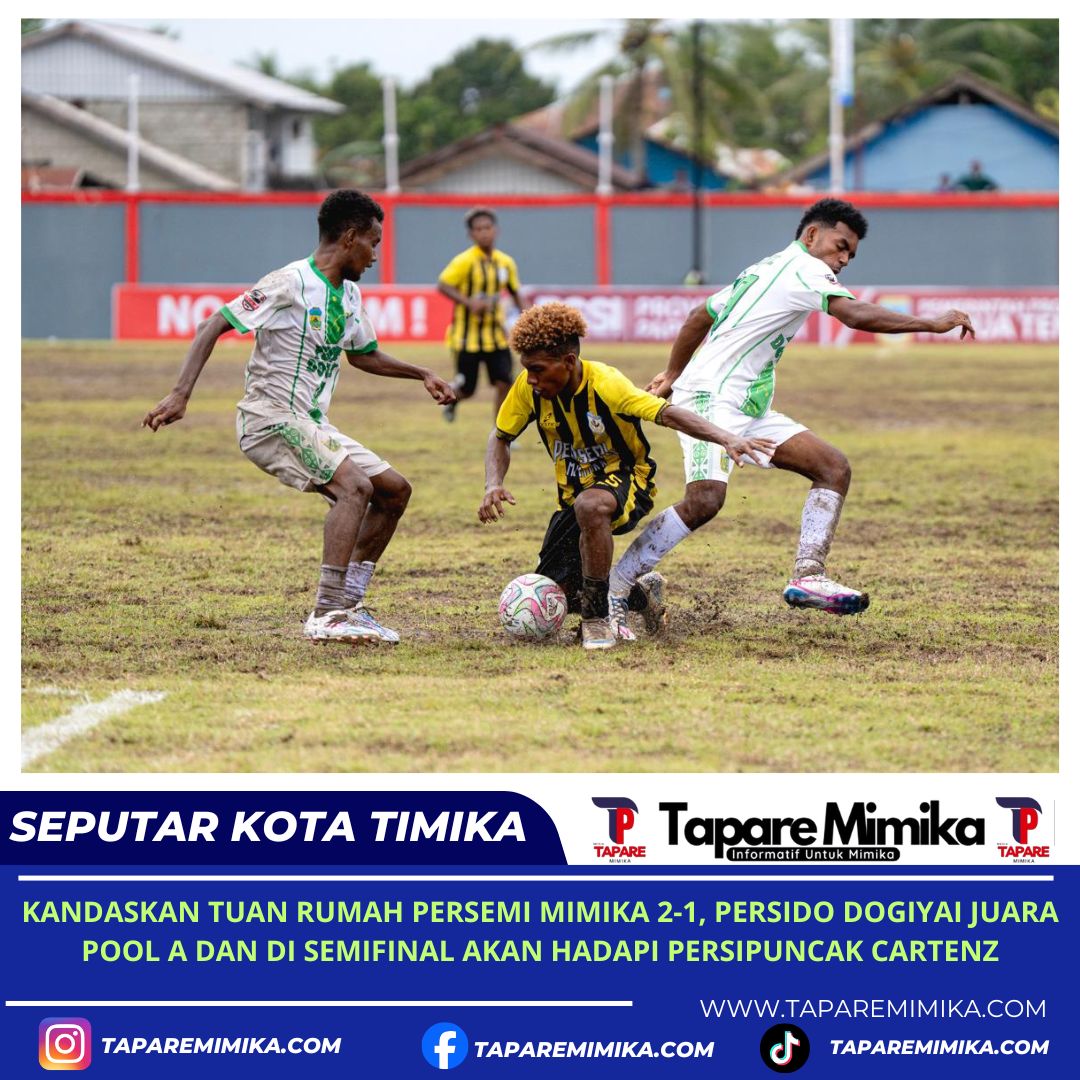 TIMIKA, (taparemimika.com) – Berhasil mengkandaskan harapan Persemi Mimika dengan skor tipis 2-1 dan meraih tiga poin, kesebelasan Persido Dogiyai tampil sebagai juara Pool A dengan poin 7, dan akan bertemu kesebelasan Persipuncak Cartenz dengan sebagai Runner Up Pool B dibabak semifinal yang baru akan digelar di Stadion Wania Imipi Timika, kabupaten Mimika pada Senin (16/3/2026) mendatang.