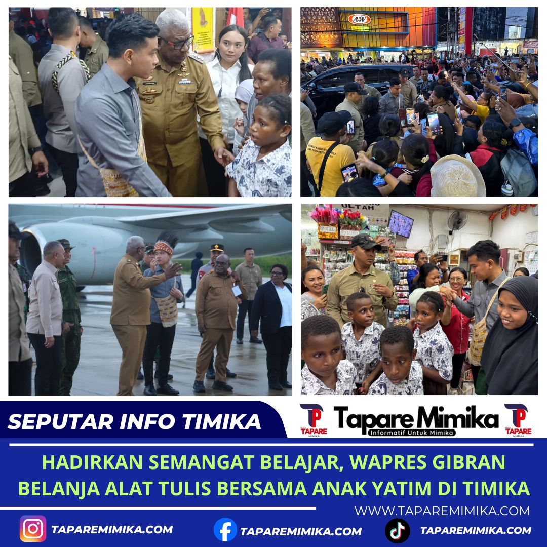 TIMIKA, (taparemimika.com) – Usai merampungkan rangkaian kegiatan di Nabire, Wakil Presiden (Wapres) Gibran Rakabuming langsung melanjutkan agenda kunjungan kerjanya ke Timika, Papua Tengah. Setibanya di Timika, ia langsung menyambangi toko alat tulis “Meriah” untuk menemani 60 anak yatim berbelanja perlengkapan sekolah, Senin sore (20/04/2026).